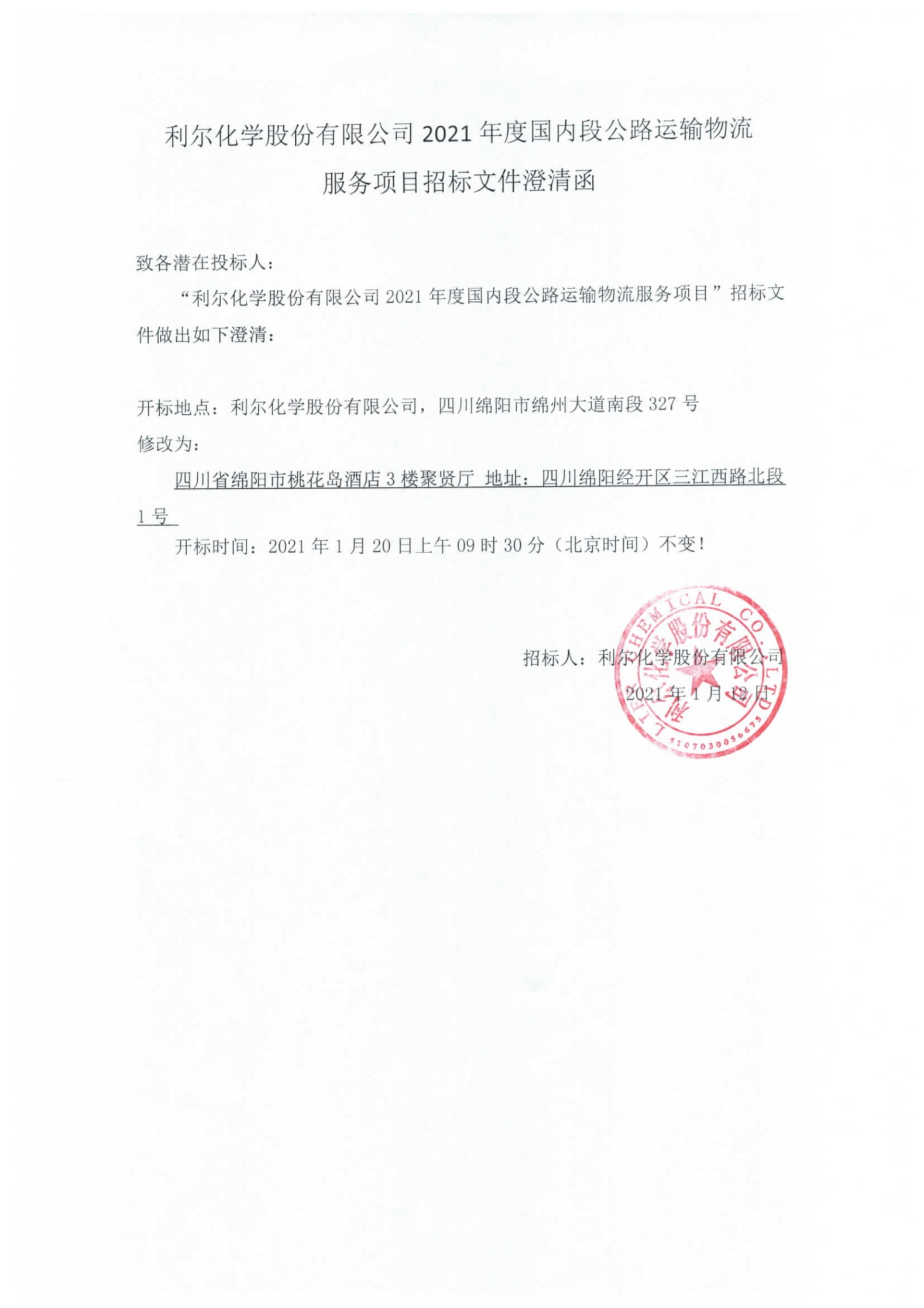 利爾化學(xué)股份有限公司2021年度國內(nèi)段公路運(yùn)輸物流服務(wù)項(xiàng)目招標(biāo)文件澄清函